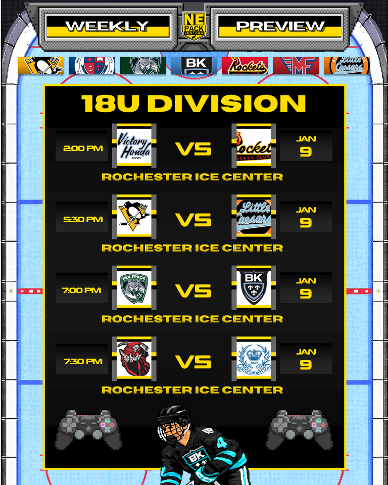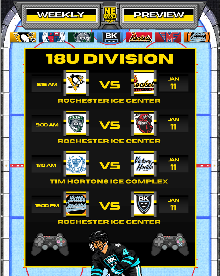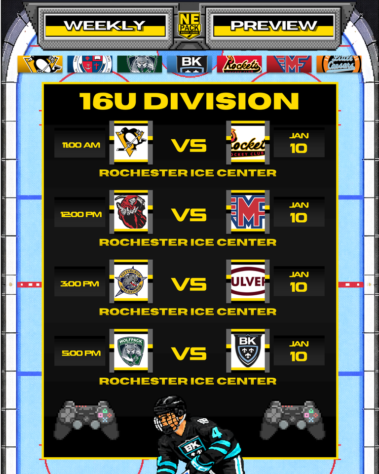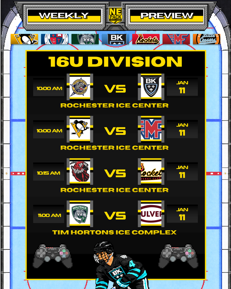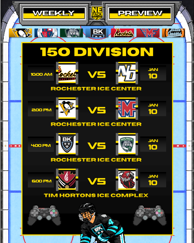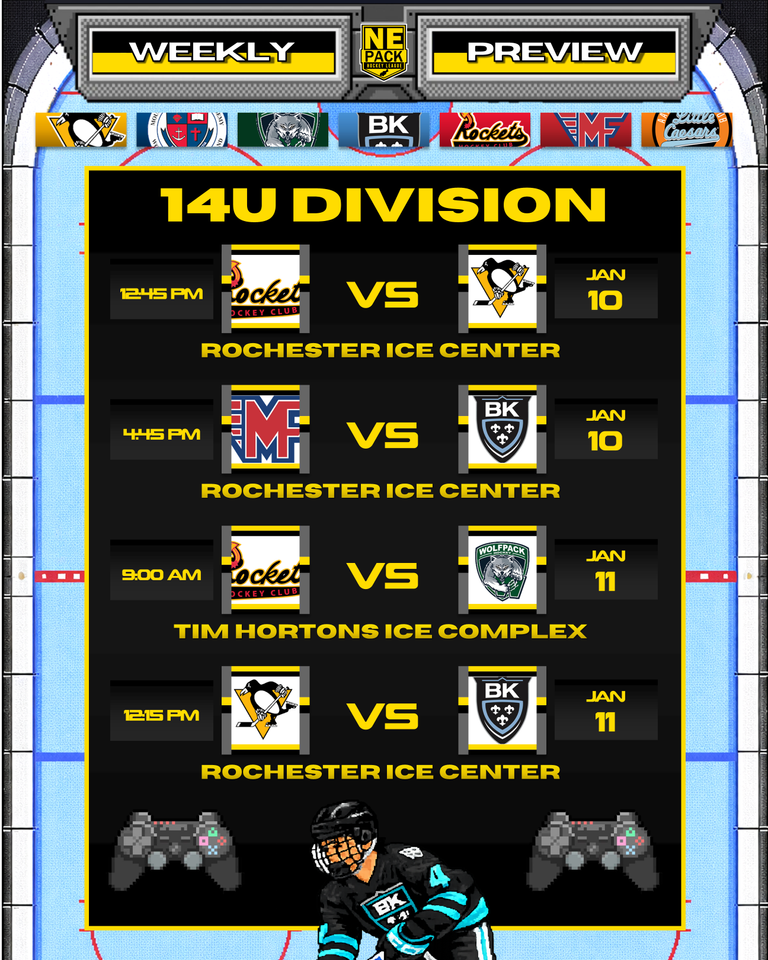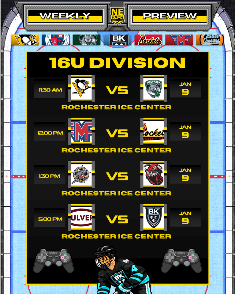 The Northeast Pack Hockey League has their first showcase of the 2026 New Year in Rochester, NY on January 9-11. Bishop Kearney Selects will be hosting the event. The ages are 14U (2011), 15O (2010), 16U & 18U. The league is excited to host our league members as well as guest teams that are attending the showcase. This event is the final showcase of the 25-26 regular season. The Northeast Pack Hockey League playoffs will be held in Utica, NY on February 6-8, 2026. The best of luck to all teams participating this weekend in Rochester, NY!