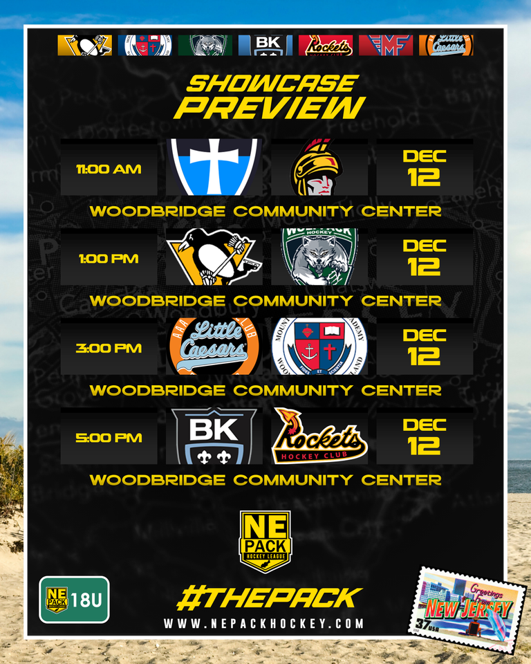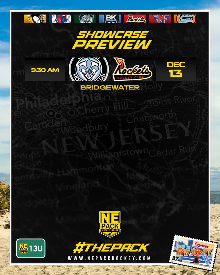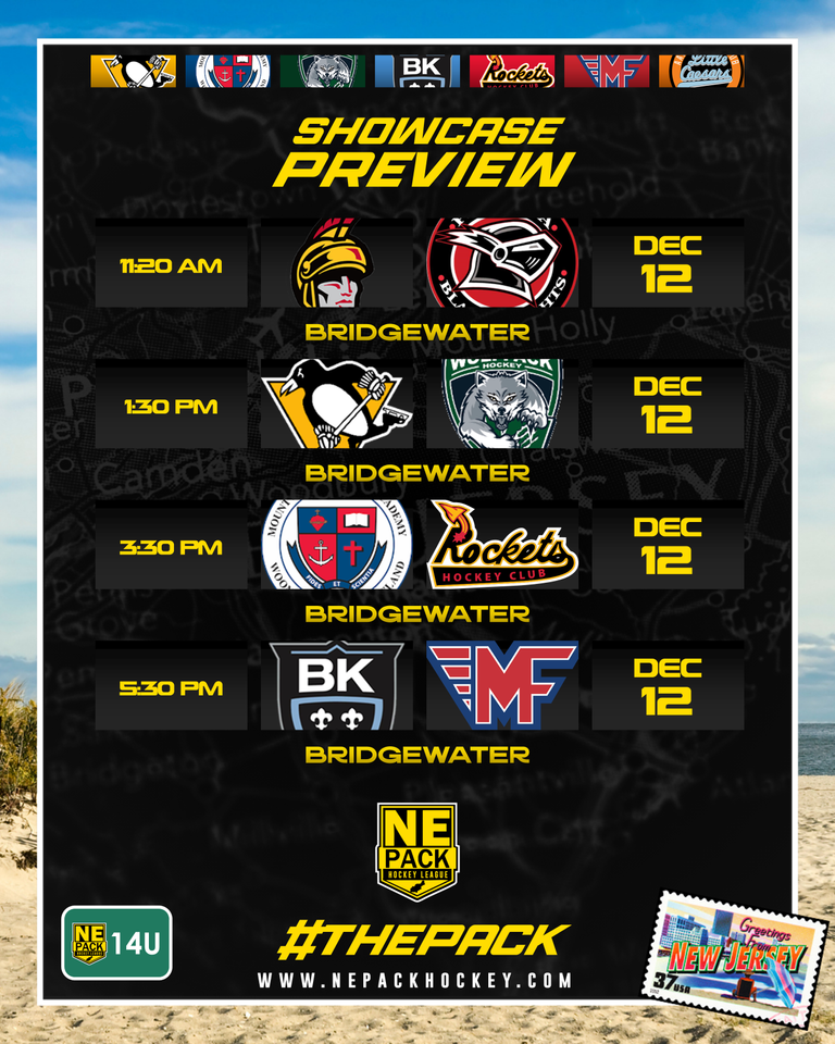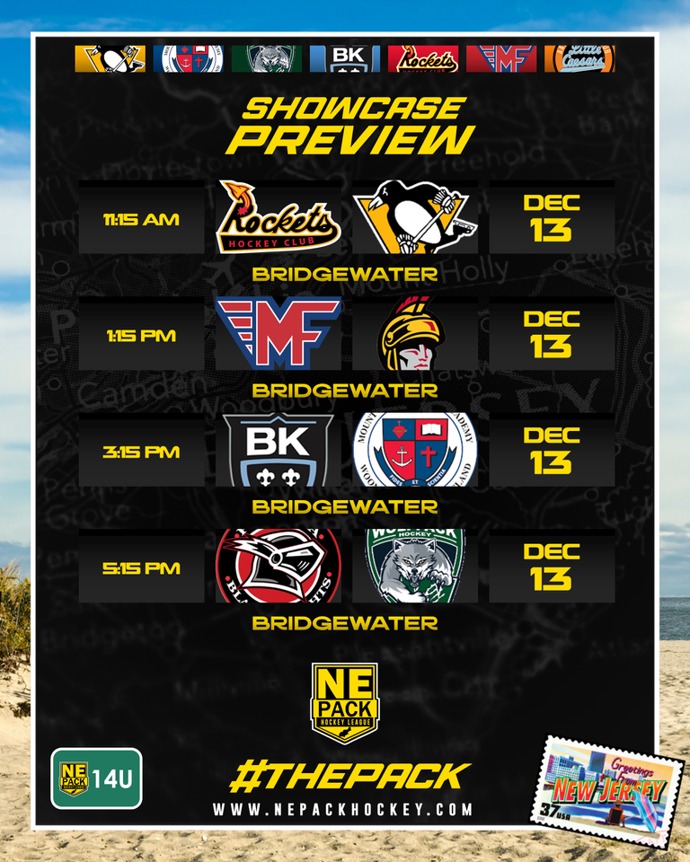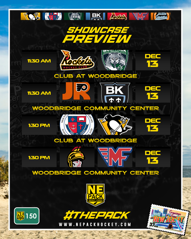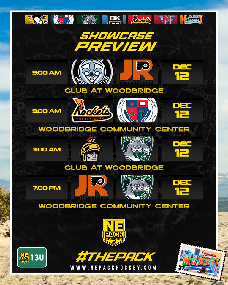 The Northeast Pack Hockey League will host a league showcase in New Jersey on December 12-14, 2025 for ages 13U-18U. This will be the first and only event of the season that has the 13U (2012) age division participating. We are excited to host the 13U teams as they are the future of the Northeast Pack Hockey League! Thank you to the New Jersey Rockets and the Wolfpack Hockey Club for hosting this showcase. Please see the slides below for the weekend preview. Best of luck to all teams participating.