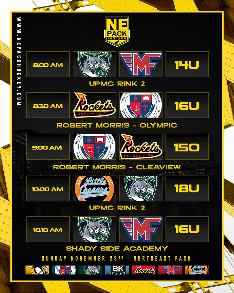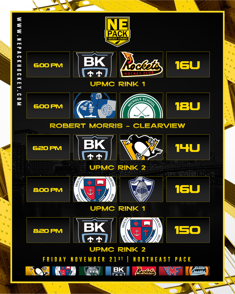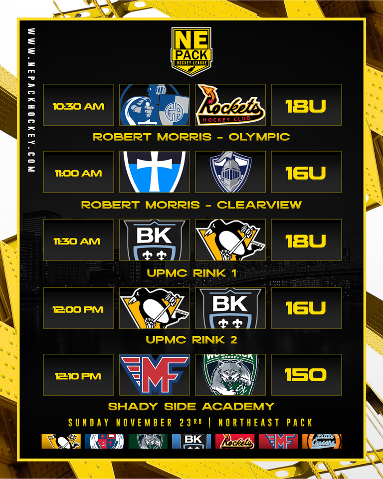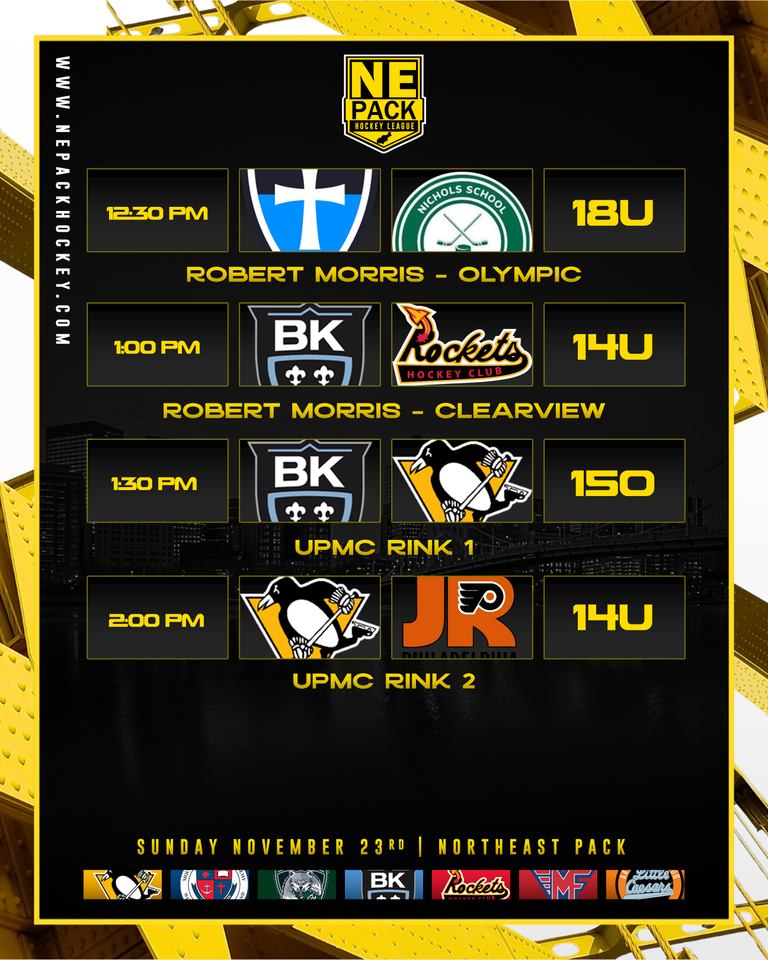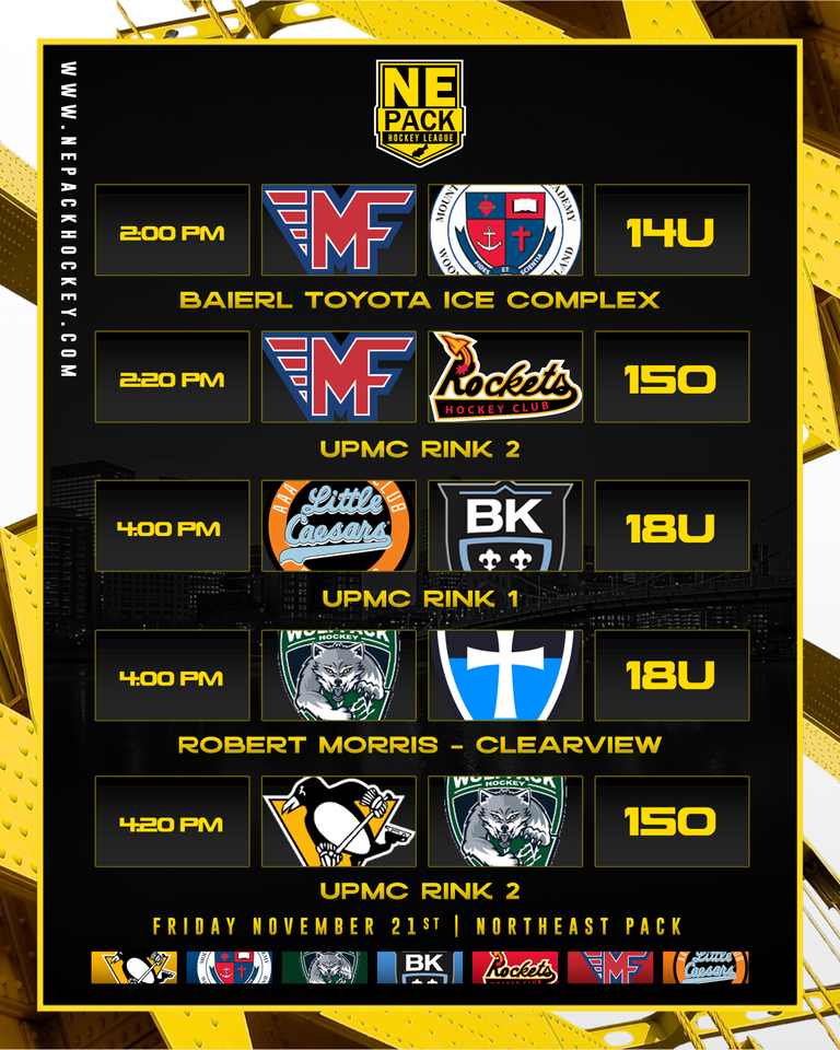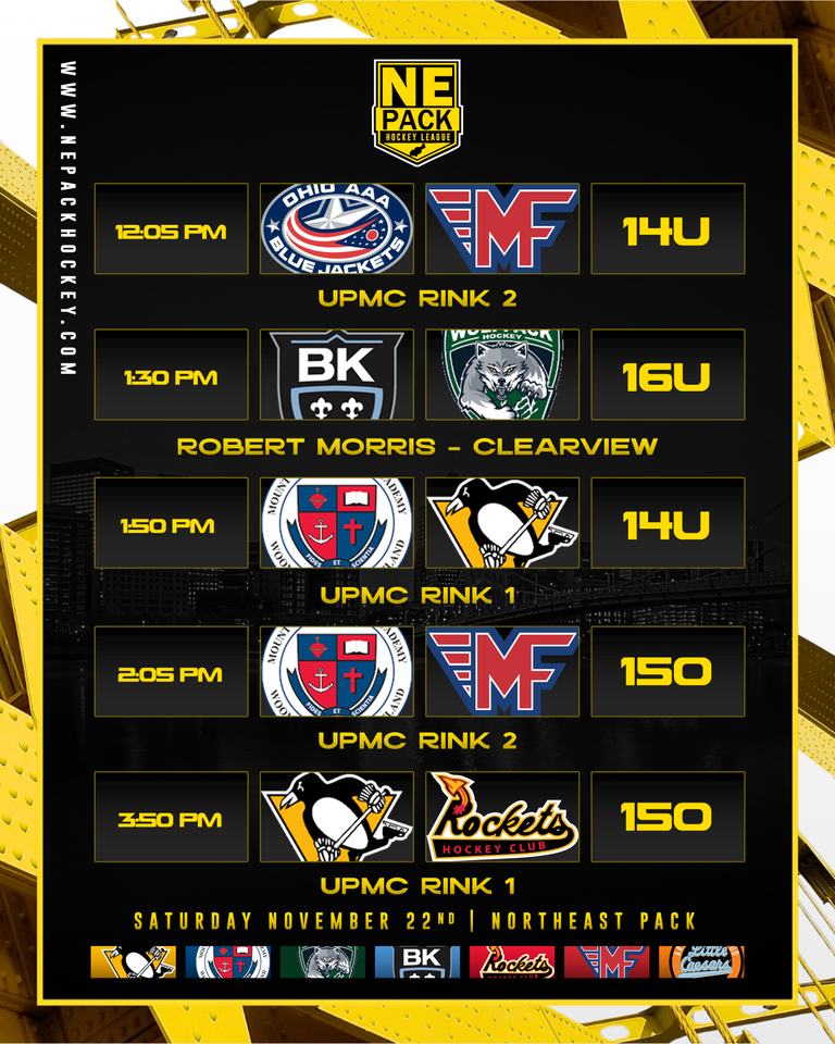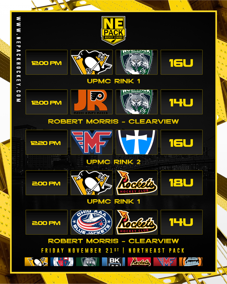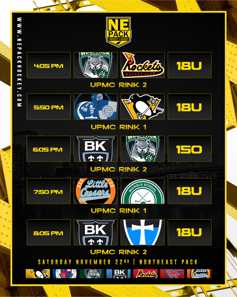 The Northeast Pack Hockey League will have a showcase on November 21-23, 2025 hosted by the Pittsburgh Penguins Elite organization. Please see the preview below for all games in the showcase. The best of luck to all teams participating and thank you to the Penguins Elite for hosting.